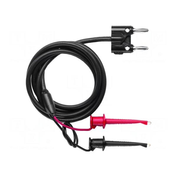 Przewód pomiarowy przeznaczony do zastosowań o napięciu znamionowym do 300V DC oraz natężeniu prądu do 5A. Konstrukcja elementu obejmuje dwa chwytaki haczykowe oraz podwójny wtyk bananowy wyposażony w gniazdo osiowe i poprzeczne 4mm.