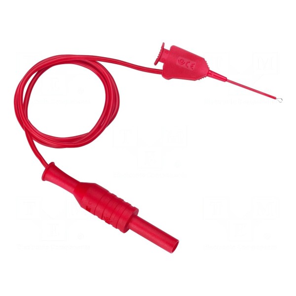 Przewód pomiarowy charakteryzuje się konstrukcją wyposażoną w chwytak haczykowy oraz wtyk bananowy o średnicy 4mm. Produkt przystosowany jest do pracy z napięciem znamionowym wynoszącym 33V AC oraz 70V DC przy maksymalnym prądzie znamionowym 1A.