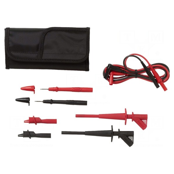 Zestaw zawiera elementy niezbędne do wykonywania pomiarów elektrycznych, w tym przewody pomiarowe dostępne w dwóch kolorach: czarnym oraz czerwonym. Komplet pozwala na elastyczną konfigurację stanowiska pomiarowego zgodnie z bieżącymi potrzebami użytkownika.