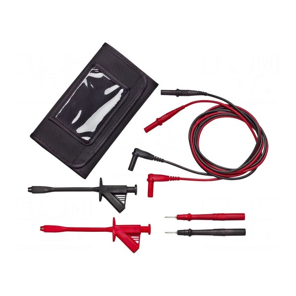 Zestaw zawiera dwa przewody pomiarowe w kolorze czarnym i czerwonym. Komplet obejmuje również chwytaki pomiarowe, dwie sondy pomiarowe oraz dodatkowy przewód o długości 0,3 m wyposażony w zatrzaski żeńskie 10 mm.
