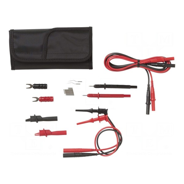 Zestaw zawiera przewody pomiarowe oraz dedykowane akcesoria, przeznaczone do wykonywania połączeń w układach pomiarowych. Elementy zestawu występują w kolorystyce czarnej oraz czerwonej, co ułatwia identyfikację polaryzacji podczas pracy.