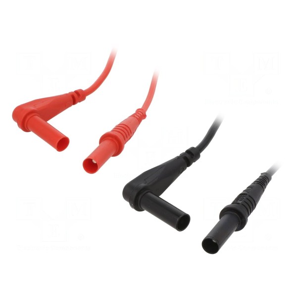 Przewody pomiarowe o długości 1,219 m przeznaczone są do pracy z napięciem do 1 kV oraz prądem znamionowym 10 A. Zestaw składa się z dwóch sztuk w kolorach czarnym i czerwonym. Złącza wyposażone są w wtyki bananowe 4 mm, w tym jeden wtyk kątowy, i charakteryzują się izolowaną konstrukcją.