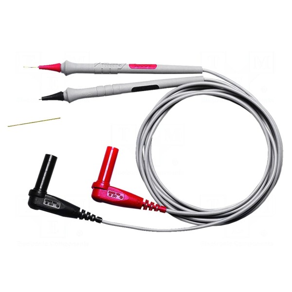 Wyposażenie zestawu obejmuje dwa przewody pomiarowe oraz dwie końcówki pomiarowe typu ostrzowego. Produkt jest zgodny z normą EN 61010 oraz spełnia wymogi bezpieczeństwa kategorii CAT II 1000V. Izolowane złącza zapewniają bezpieczeństwo podczas eksploatacji w warunkach laboratoryjnych i serwisowych.