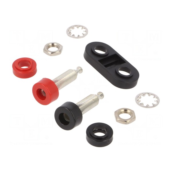 Podwójne gniazdo bananowe o średnicy 4mm zaprojektowane do montażu na panelu. Element charakteryzuje się napięciem znamionowym wynoszącym 2,5kV oraz prądem znamionowym o wartości 15A.