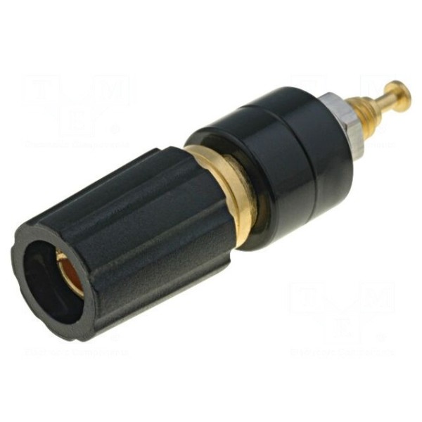Gniazdo bananowe 4mm w kolorze czarnym przeznaczone jest do montażu na panelu. Element charakteryzuje się prądem znamionowym 15A oraz napięciem znamionowym 70V DC.