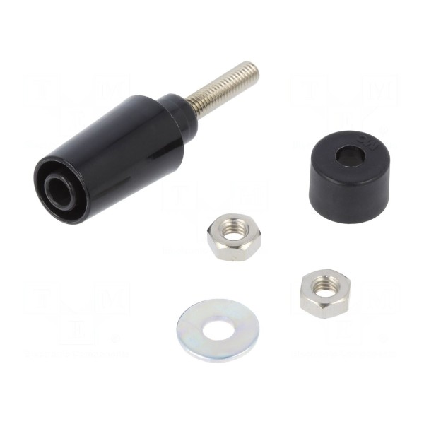Konstrukcja wykonana z mosiądzu posiada wyprowadzenia kołkowe. Całkowita długość elementu wynosi 45mm, a jego kolor to czarny. Produkt spełnia wymagania normy EN 61010 w kategorii CAT II 1000V.
