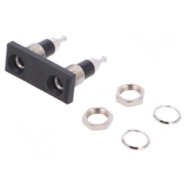 Złącze laboratoryjne typu bananowego o średnicy 4 mm w wersji podwójnej. Produkt przeznaczony jest do montażu na panelu za pomocą połączenia lutowanego, przy czym wymagany otwór montażowy wynosi 8,3 mm przy rastrze 19 mm.