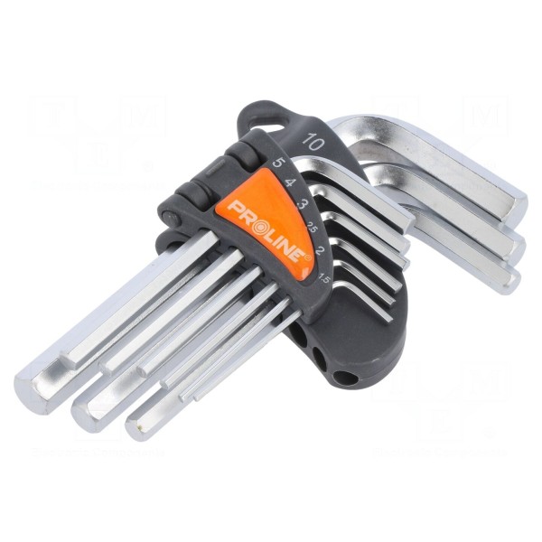 Zestaw zawiera dziewięć kluczy typu imbus wykonanych ze stali chromowo-wanadowej. W skład kompletu wchodzą klucze o wymiarach HEX 1,5mm, 2mm, 2,5mm, 3mm, 4mm, 5mm, 6mm, 8mm oraz 10mm.