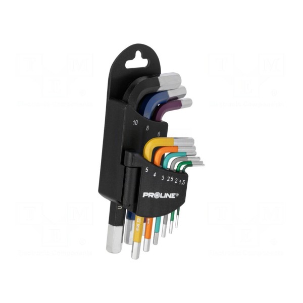 Zestaw zawiera 9 kluczy typu imbus wykonanych ze stali S2. W skład kompletu wchodzą rozmiary HEX 1,5mm, 2mm, 2,5mm, 3mm, 4mm, 5mm, 6mm, 8mm oraz 10mm.