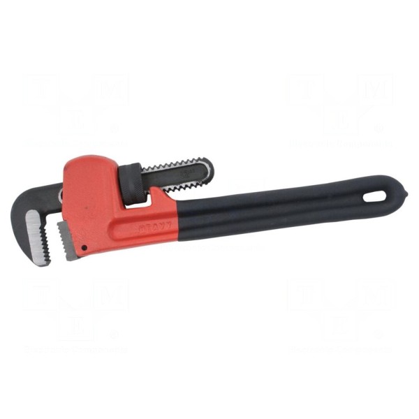 Całkowita długość narzędzia wynosi 200 mm. Regulowana szczęka pozwala na dopasowanie rozwarcia do średnicy obrabianego elementu rurowego.