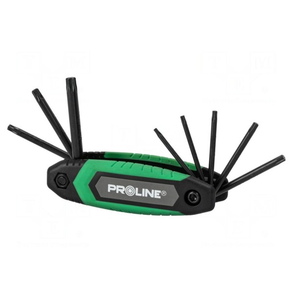 Zestaw kluczy typu Torx zawiera 8 elementów o zróżnicowanych rozmiarach roboczych. W skład kompletu wchodzą końcówki: TX9, TX10, TX15, TX20, TX25, TX27, TX30 oraz TX40.