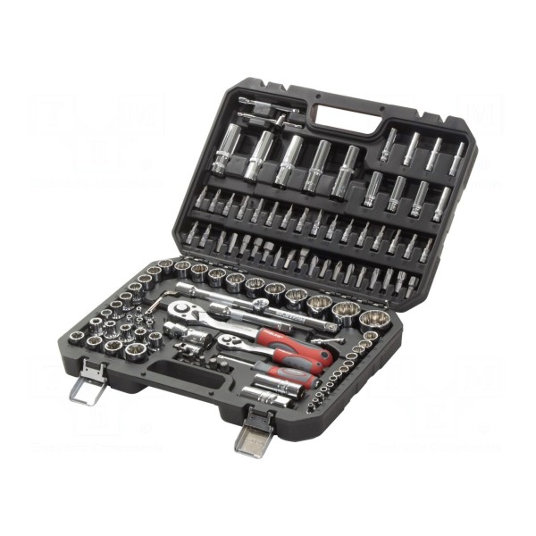 W zestawie znajdują się: grzechotka 1/2", grzechotka 1/4", końcówki wkrętakowe, nasadki 12-kątne 1/2", nasadki 12-kątne 1/4", przedłużacz 1/2" o długości 125mm, przedłużacz 1/2" o długości 250mm, przedłużacz 1/4" o długości 50mm oraz przedłużacz 1/4" o długości 100mm. Całość uporządkowana jest w walizce, która ułatwia transport oraz przechowywanie elementów.
