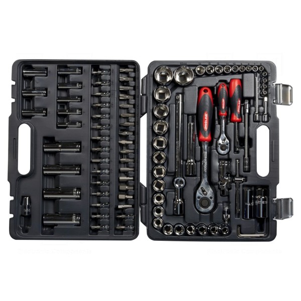Zestaw narzędzi zawiera 94 elementy typu klucz nasadowy 6-kątny. Komplet przystosowany jest do pracy z uchwytami o rozmiarach 1/2" oraz 1/4", co umożliwia szeroki zakres zastosowań przy pracach montażowych i serwisowych.
