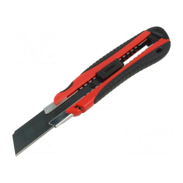 Nóż uniwersalny z wysuwanym, łamanym ostrzem o szerokości 25mm służy do różnorodnych prac warsztatowych i technicznych. Konstrukcja narzędzia pozwala na łatwą wymianę oraz stopniowe odłamywanie zużytych segmentów ostrza.