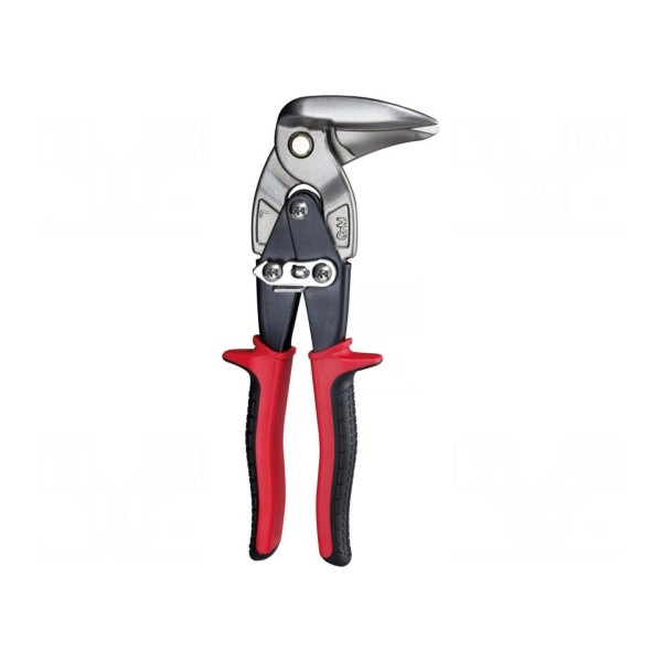 Nożyce o konstrukcji kątowej lewej służą do cięcia blachy wykonanej ze stali, miedzi oraz aluminium. Długość całkowita narzędzia wynosi 220mm.