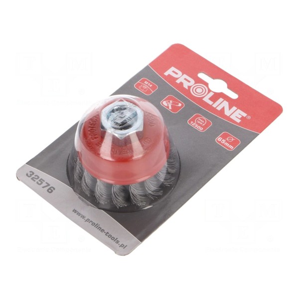 Szczotka doczołowa przeznaczona jest do pracy z elektronarzędziami wyposażonymi w uchwyt z gwintem M14. Element posiada średnicę 65mm.