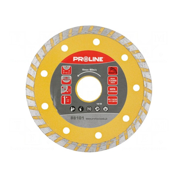 Tarcza tnąca diamentowa o średnicy 115 mm przeznaczona jest do cięcia twardych materiałów budowlanych. Produkt charakteryzuje się grubością tarczy wynoszącą 2 mm oraz konstrukcją typu Turbo, która wspiera wydajność podczas pracy.