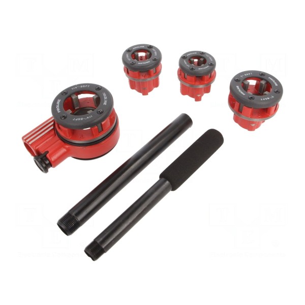 Komplet pozwala na dopasowanie średnicy gwintowania do wymagań konkretnej instalacji. Zestaw został zaprojektowany do prac montażowych i serwisowych związanych z obróbką rur gwintowanych.