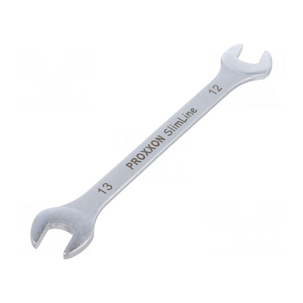 Klucz płaski dwustronny wykonany ze stali chromowo-wanadowej. Narzędzie posiada dwa końce robocze o rozmiarach 12 mm oraz 13 mm.
