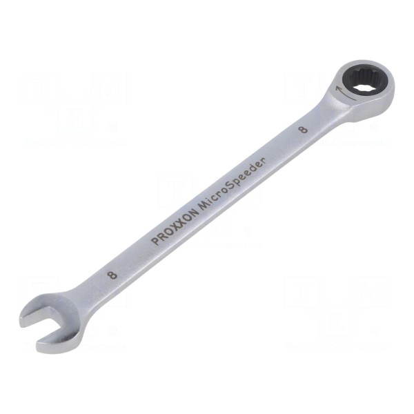Klucz płasko-oczkowy wyposażony w mechanizm grzechotkowy to narzędzie przeznaczone do prac wymagających efektywnego dokręcania i odkręcania śrub w ograniczonych przestrzeniach. Model ten posiada stały rozmiar końcówki wynoszący 8mm.