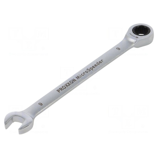 Klucz płasko-oczkowy wyposażony w mechanizm grzechotkowy typu MicroSpeeder. Rozmiar narzędzia wynosi 9 mm.