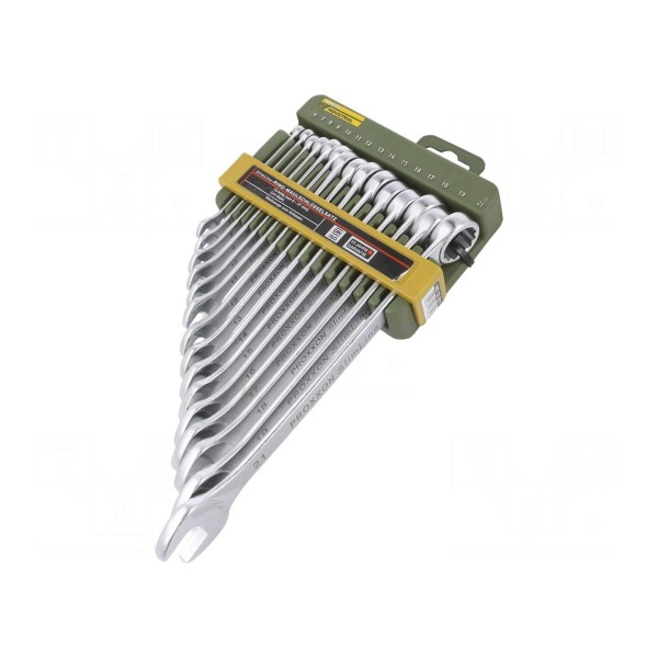 W komplecie znajdują się klucze o wymiarach 6mm, 7mm, 8mm, 9mm, 10mm, 11mm, 12mm, 13mm, 14mm, 15mm, 16mm, 17mm, 18mm, 19mm oraz 21mm. Konstrukcja narzędzi jest zgodna z normami DIN 3110 oraz ISO 3318.