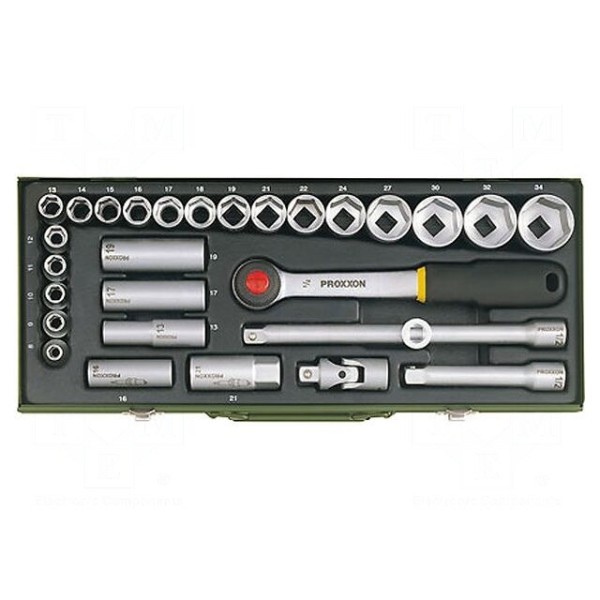 W zestawie: nasadka do świec zapłonowych 16mm, nasadka do świec zapłonowych 21mm, nasadki 1/2" 8-34mm, nasadki 1/2" przedłużane (80mm) 10-13-17mm, przedłużka 1/2" 125mm, przedłużka z kwadratem 1/2" 250mm, przegub Cardana 1/2", uchwyt 1/2" z grzechotką.