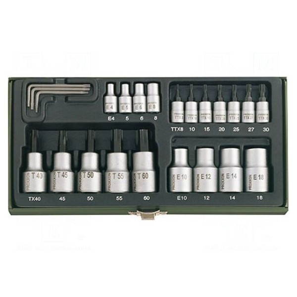 W skład kompletu wchodzą trzy wygięte klucze w rozmiarach TX6, TX8 oraz TX10. Zestaw uzupełniają nasadki typu TX na mocowanie 1/2" oraz nasadki typu TX na mocowanie 1/4" w zakresie od TX8 do TX30, a także nasadki E4 – E8.