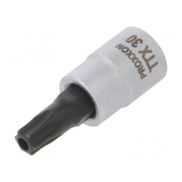 Nasadka PROXXON 23762 to typ klucza nasadowego przeznaczonego do obsługi śrub z gniazdem typu Torx z zabezpieczeniem, oznaczonym jako T30H. Element został wyposażony w gniazdo uchwytu o rozmiarze 1/4 cala.