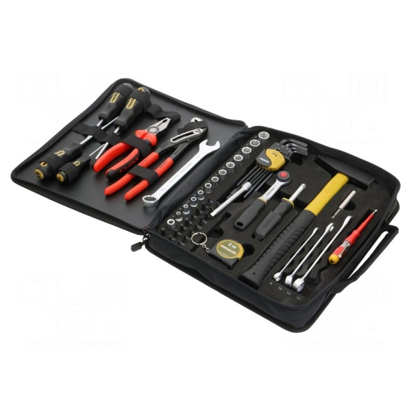 W zestawie znajdują się szczypce uniwersalne o długości 180 mm, przystosowane do chwytania, gięcia oraz cięcia drutu lub elementów metalowych. Wszystkie narzędzia wchodzące w skład kompletu zostały dobrane pod kątem uniwersalności w typowych zadaniach technicznych. Zestaw stanowi samodzielny pakiet wyposażenia dla użytkowników potrzebujących podstawowego kompletu narzędzi ręcznych.