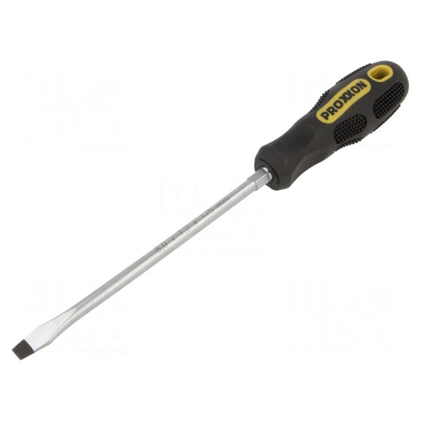 Wkrętak standardowy PROXXON PR22018 wyposażony jest w płaski grot o wymiarach 8x1,2mm. Narzędzie posiada ostrze o długości 175mm, przystosowane do pracy z elementami złącznymi o odpowiednim profilu nacięcia.