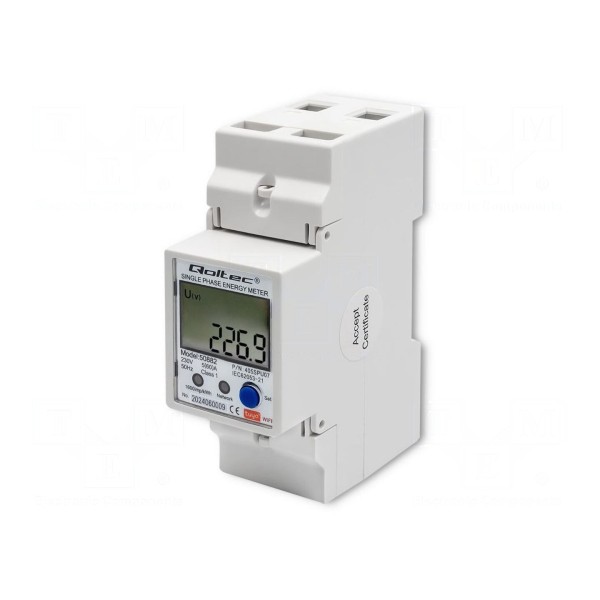 Licznik energii elektrycznej QOLTEC 50882 to cyfrowe urządzenie montażowe przystosowane do pracy w sieciach jednofazowych. Przyrząd obsługuje napięcie znamionowe 0,23kV przy częstotliwości pracy 50Hz oraz prądzie maksymalnym wynoszącym 60A. Konstrukcja licznika została zoptymalizowana pod kątem instalacji na szynę DIN.