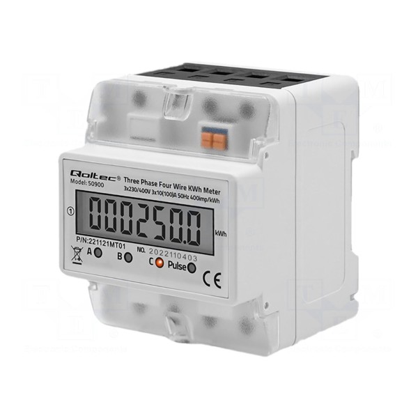 Licznik energii elektrycznej QOLTEC 50900 to cyfrowe urządzenie montażowe przeznaczone do pomiaru energii elektrycznej czynnej w sieciach 3-fazowych. Urządzenie pracuje z częstotliwością 50Hz, obsługując napięcia znamionowe 0,23kV oraz 0,4kV. Maksymalny prąd pracy dla tego modelu wynosi 100A.