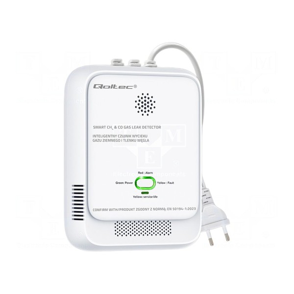 Wykrywacz gazu marki Qoltec to urządzenie przeznaczone do monitorowania obecności metanu, propan-butanu oraz tlenku węgla w pomieszczeniach. Przyrząd wykorzystuje dwa rodzaje sensorów: elektrochemiczny oraz półprzewodnikowy, zapewniając skuteczną detekcję zagrożeń. Urządzenie pracuje w zakresie temperatur od -10°C do 40°C i charakteryzuje się poziomem dźwięku alarmu wynoszącym 85 dB w odległości 3 metrów.