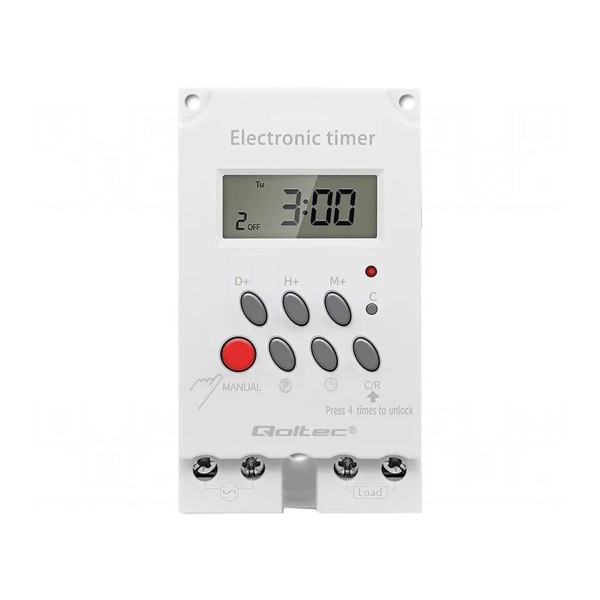 Programator czasowy QOLTEC przeznaczony jest do montażu na szynie DIN, obsługując instalacje o napięciu pracy w zakresie 220...240V AC przy częstotliwości 50...60Hz. Urządzenie pozwala na obciążenie prądem maksymalnym do 30A. Odczyt parametrów oraz bieżącej godziny i daty odbywa się za pomocą zintegrowanego wyświetlacza LCD.