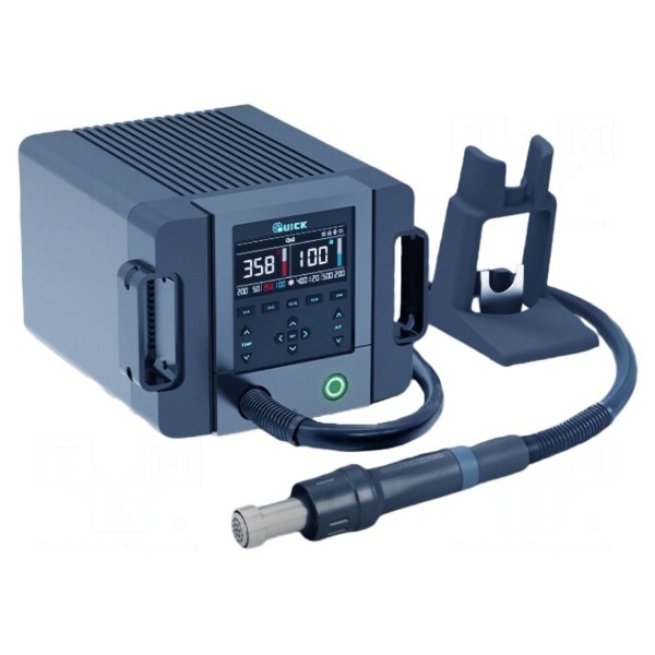 Stacja gorącego powietrza QUICK 861PRO o mocy 1,3kW służy do prac związanych z rozlutowywaniem komponentów SMD oraz SOP. Urządzenie umożliwia cyfrową regulację temperatury w szerokim zakresie od 50°C do 550°C przy maksymalnym przepływie powietrza wynoszącym 70l/min. Kontrolę nad parametrami pracy zapewnia czytelny wyświetlacz typu OLED.