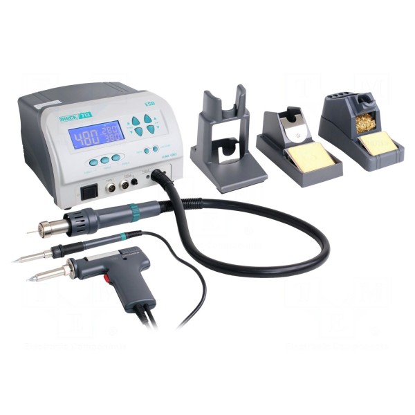 Stacja serwisowa QUICK 713 to urządzenie wyposażone w elektromagnetyczne grzałki, przeznaczone do lutowania oraz rozlutowywania elementów SMD i THT, w tym w technologii bezołowiowej. Układ nawiewu gorącego powietrza dysponuje mocą 1000 W i oferuje regulację przepływu w zakresie 1–120 l/min przy temperaturze pracy od 100°C do 500°C. Moduły lutownicy oraz rozlutownicy osiągają moc 90 W każdy, pracując w stabilnym zakresie temperatur od 200°C do 480°C z zachowaniem stabilności temperaturowej na poziomie ±2°C. Rozlutownica generuje podciśnienie rzędu 600 mmHg.