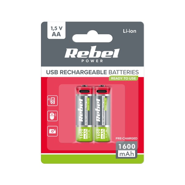 Akumulatorki REBEL AA, 1600 mAh, Li-ion, 1, 5V, 2szt/bl, R6, gniazdo typ C