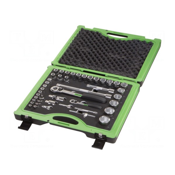 Całość zestawu jest przechowywana w dedykowanej walizce, która ułatwia transport i organizację narzędzi. W zestawie: adapter, grzechotka, przedłużka, przegub Cardana.