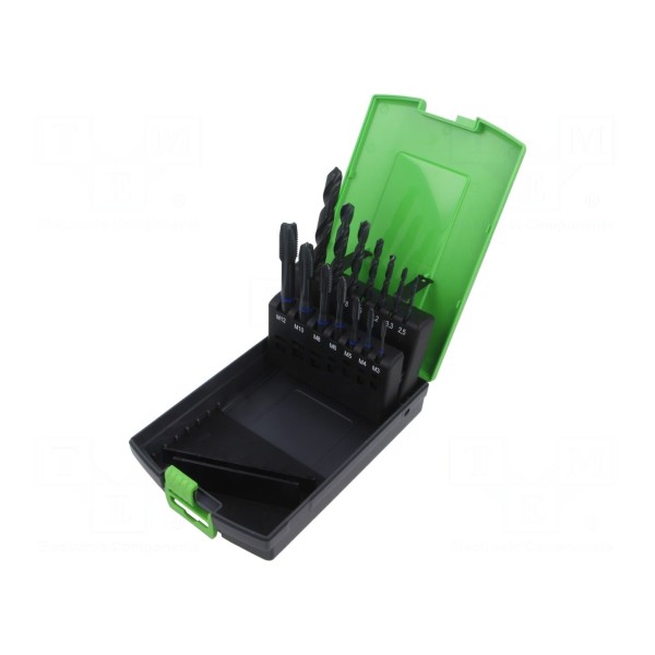 W skład zestawu wchodzą wiertła o średnicach 2,5 mm, 3,3 mm, 4,2 mm, 5 mm, 6,8 mm, 8,5 mm oraz 10,2 mm. Konstrukcja narzędzi jest zgodna z normami DIN 371 oraz DIN 376. W zestawie: gwintowniki, wiertła.