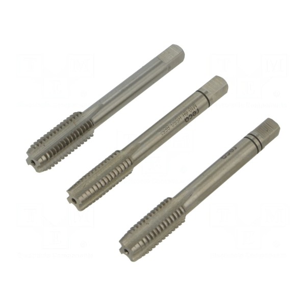 W skład kompletu wchodzą gwintowniki w wersji wstępnej, pośredniej oraz wykańczającej, co pozwala na stopniowe nacinanie gwintu w obrabianym materiale. W zestawie: gwintowniki.