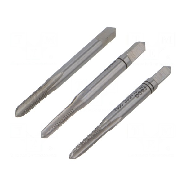 Konstrukcja gwintowników przewiduje montaż w uchwycie o kwadratowym gnieździe o wymiarze 3,4mm. Długość całkowita poszczególnych elementów wynosi 45mm. W zestawie: gwintowniki.