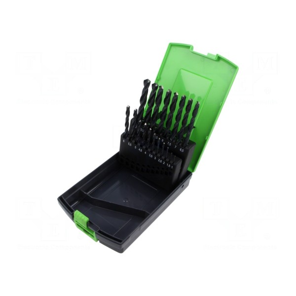 Wiertła wykonane są zgodnie z normą DIN 338. Całość dostarczana jest w kasecie z tworzywa sztucznego, która zapewnia organizację i przechowywanie elementów. W zestawie: wiertła.