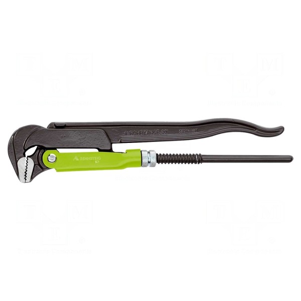 Narzędzie przeznaczone do chwytania rur, wyposażone w mechanizm nastawny umożliwiający dostosowanie rozwarcia szczęk do średnicy obrabianego elementu. Całkowita długość urządzenia wynosi 750 mm, co zapewnia odpowiednią dźwignię podczas pracy z większymi przedmiotami.