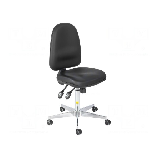 Krzesło antystatyczne przeznaczone do pracy w strefach chronionych oraz pomieszczeniach typu cleanroom klasy ISO 5. Model wyposażony w siedzisko o wymiarach 430x455mm oraz oparcie 500x440mm, pokryte winylem w kolorze czarnym. Regulowana wysokość siedziska w zakresie 570–750mm pozwala na dopasowanie do indywidualnych wymagań stanowiska pracy.