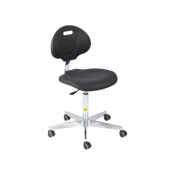 Krzesło antystatyczne przeznaczone do pracy w warunkach cleanroom klasy ISO 5. Siedzisko o wymiarach 440x465mm oraz oparcie o wymiarach 310x420mm wykonano z poliuretanu w kolorze czarnym. Konstrukcja zapewnia regulację wysokości siedziska w zakresie od 505mm do 690mm, przy maksymalnym obciążeniu wynoszącym 120kg.