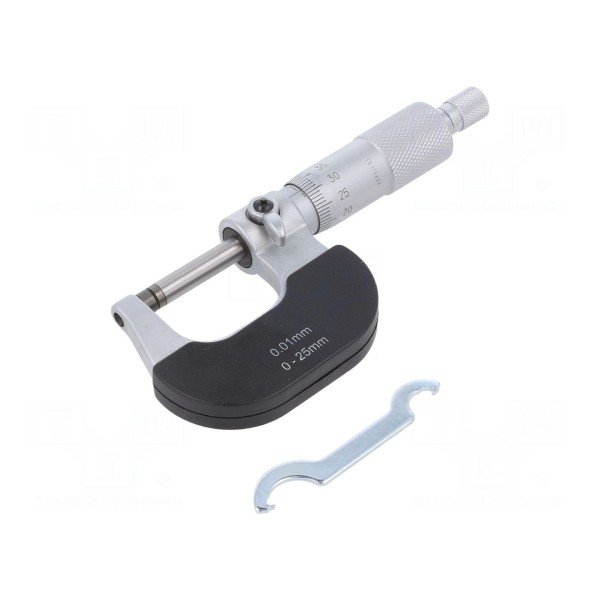 Mikrometr SCALA o zakresie pomiarowym od 0 do 25 mm przeznaczony jest do wykonywania precyzyjnych pomiarów średnic oraz grubości przedmiotów. Urządzenie charakteryzuje się dokładnością pomiaru na poziomie 0,01 mm.