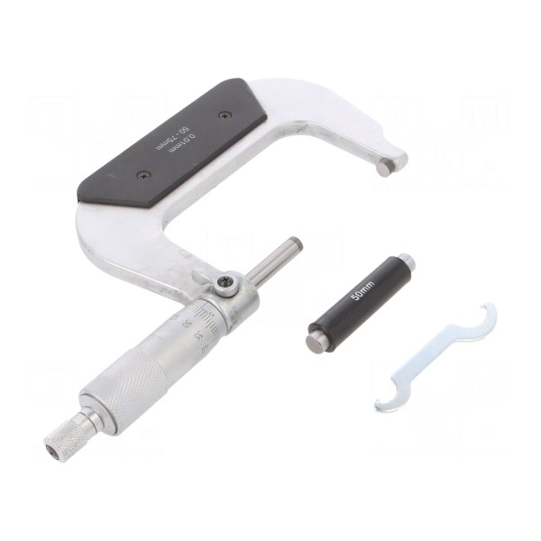 Mikrometr pozwala na wykonywanie precyzyjnych pomiarów grubości oraz średnicy przedmiotów w zakresie od 50 do 75 mm. Urządzenie charakteryzuje się dokładnością pomiaru na poziomie 0,01 mm, co pozwala na stosowanie go w pracach wymagających wysokiej dokładności wymiarowej.