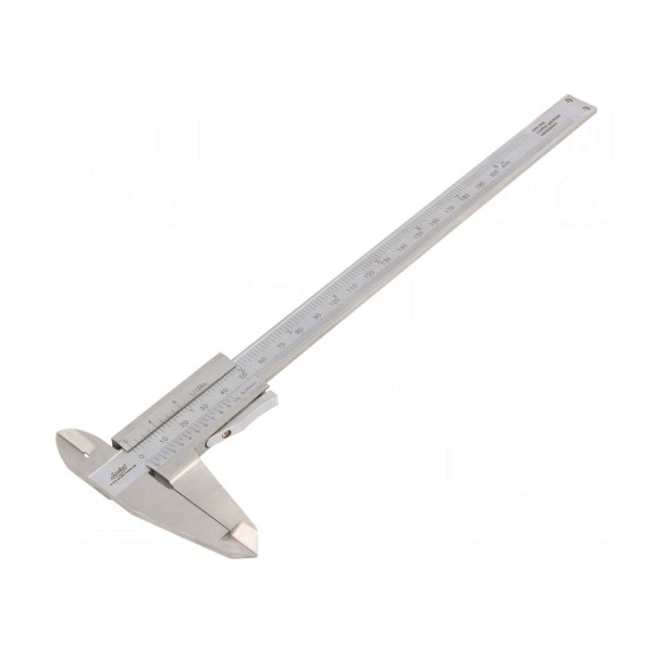 Suwmiarka o długości 200 mm wykonana ze stali chromowanej. Narzędzie zostało wyposażone w czytelny odczyt analogowy oraz śrubę blokującą, która pozwala na unieruchomienie ramienia w wybranej pozycji.
