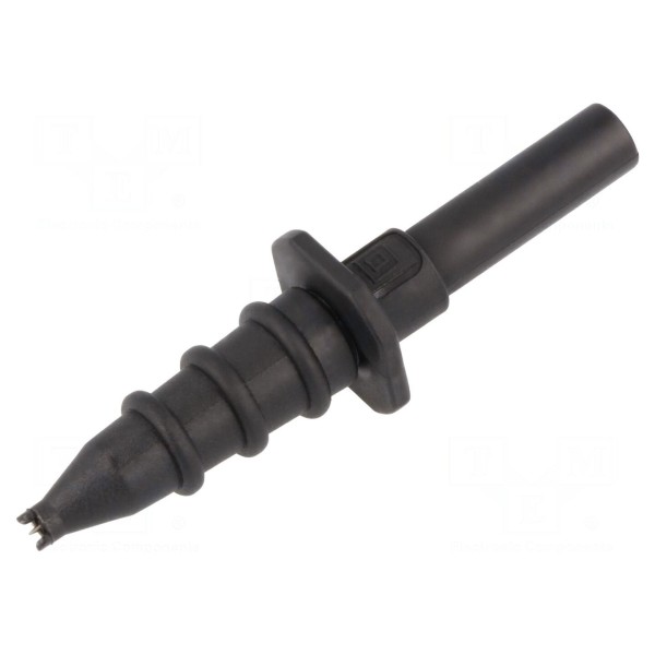 Końcówka pomiarowa o prądzie znamionowym 5A przeznaczona jest do współpracy ze złączami o rozmiarze 4mm. Element pracuje przy napięciu znamionowym 1kV DC, a jego maksymalna rezystancja styku wynosi 20mΩ. Konstrukcja zapewnia zgodność z normami bezpieczeństwa CAT II 1000V oraz EN 61010.
